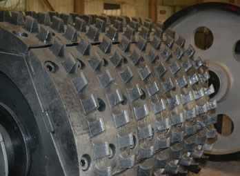 双齿辊破碎机由传动装置、机架部分、破碎辊、液压推力装置、联动机构组成,两辊轮之间装有楔形或垫片调节装置,楔形装置的顶端装有调整螺栓,当调整螺栓将楔块向上拉起时,楔块将活动辊轮顶离固定轮,即两辊轮间隙变大,出料粒度变大,当楔块向下时,活动辊轮在压紧弹簧(或压紧油缸)的作用下两轮间隙变小,出料粒度变小。垫片装置是通过增减垫片的数量或厚薄来调节出料粒度大小的,当增加垫片时两辊轮间隙变大,当减少垫片时两辊轮间隙变小,出料粒度变小。