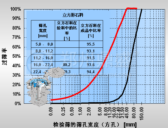 2、 玄武岩(采用衬板破碎和砂床破碎的破碎结果比较)如下图所示,应用领域:制砂/生产立方石料,物料:玄武岩,粒度:0 – 56 mm,转子速度 = 60 m/s